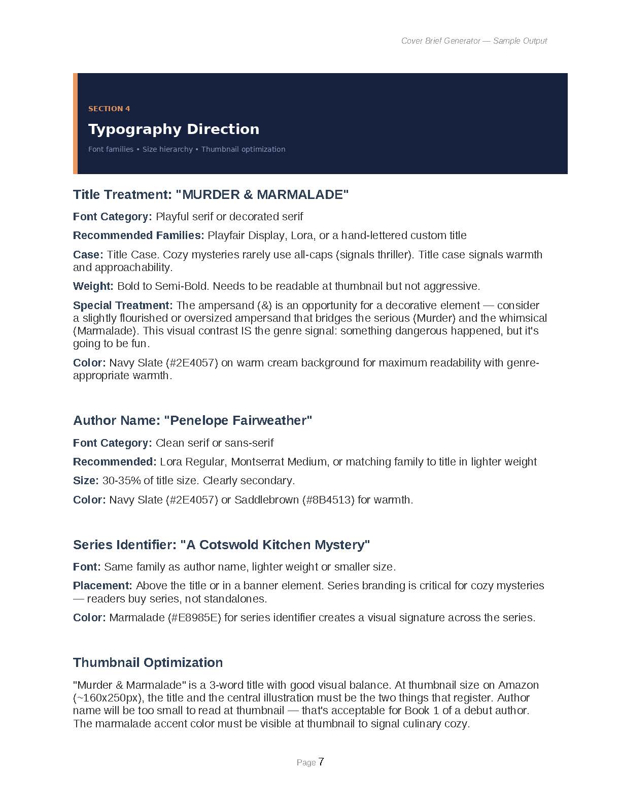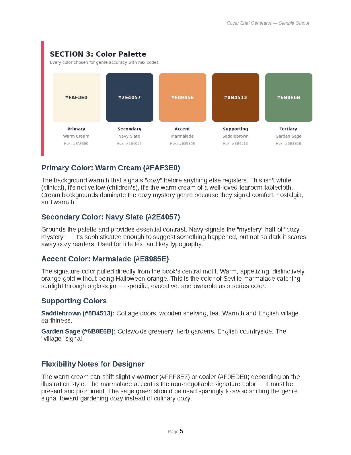 - Color Palette with Hex Codes: Primary, secondary, and accent colors tied to genre signals, with rationale and bestseller comparisons