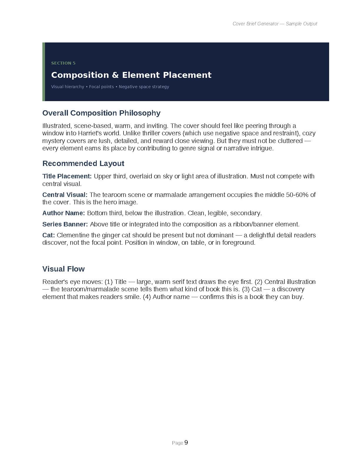 - Element Placement Strategy: Composition guidance on focal points, title/author placement, visual hierarchy, and negative space
