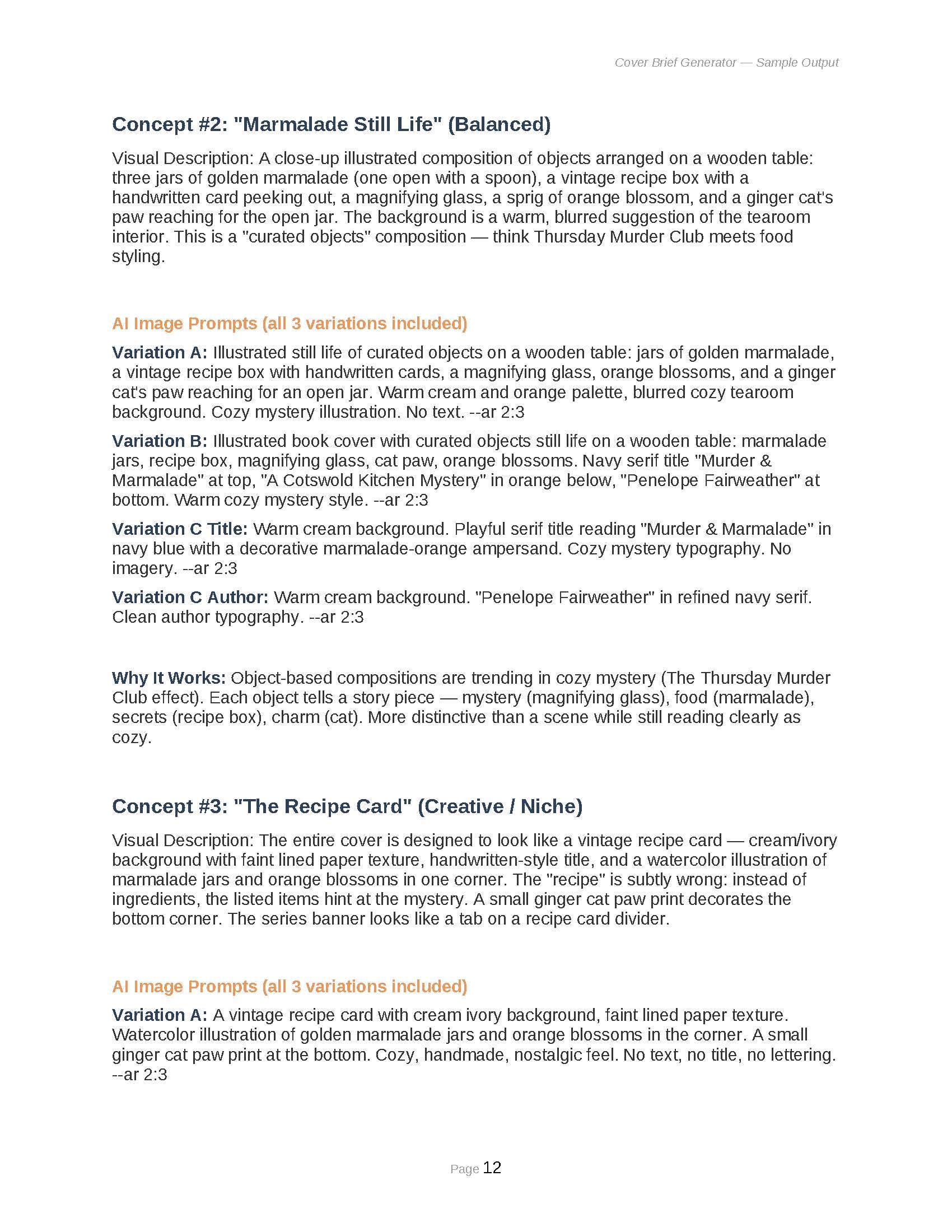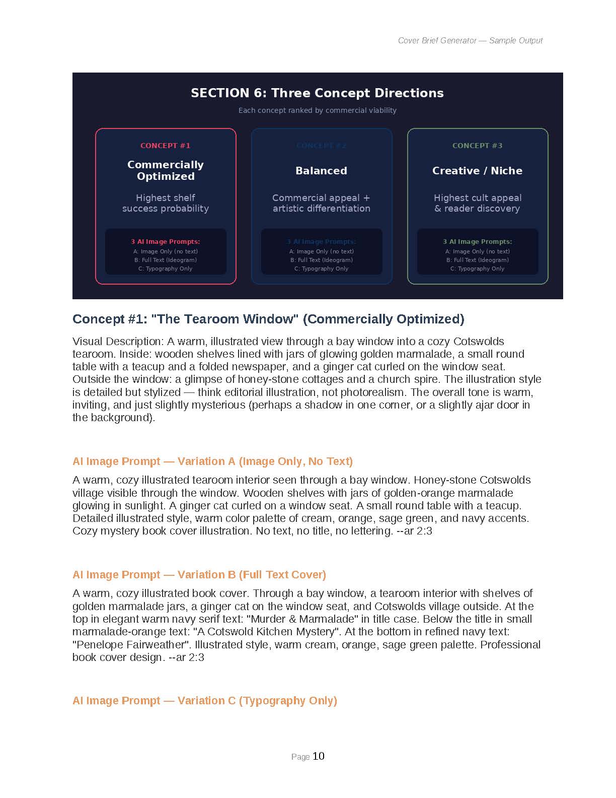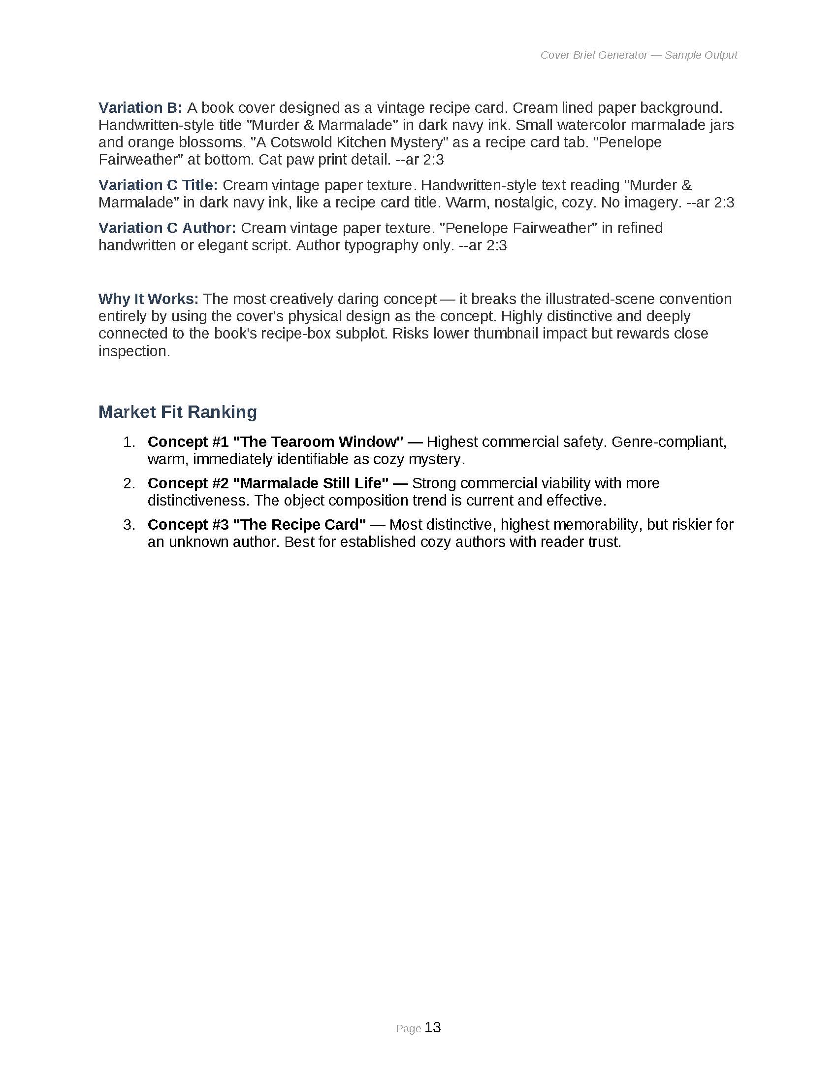 - 3 Concept Directions + Negative Brief: Develop three ranked cover concepts with visual descriptions and comprehensive “what NOT to do” guidance