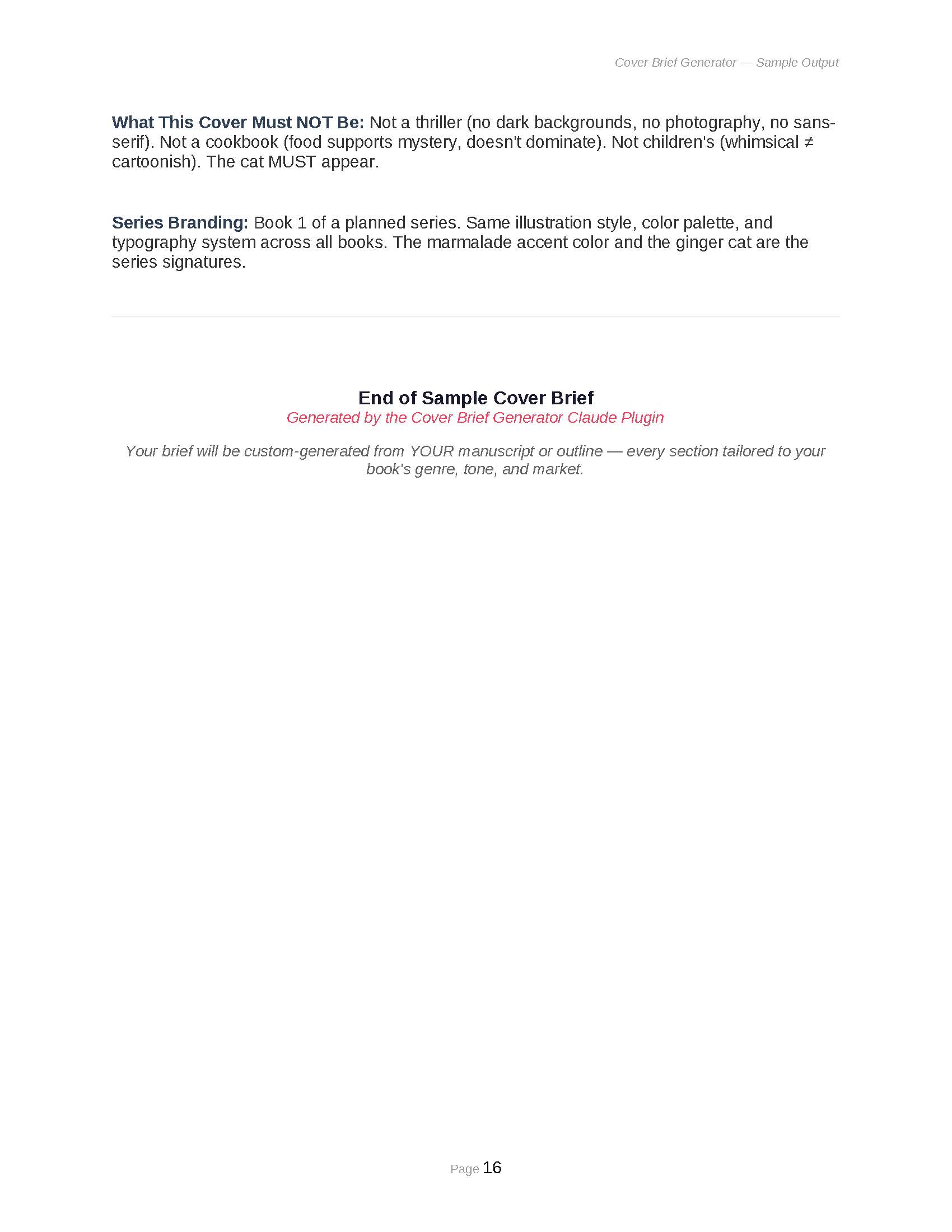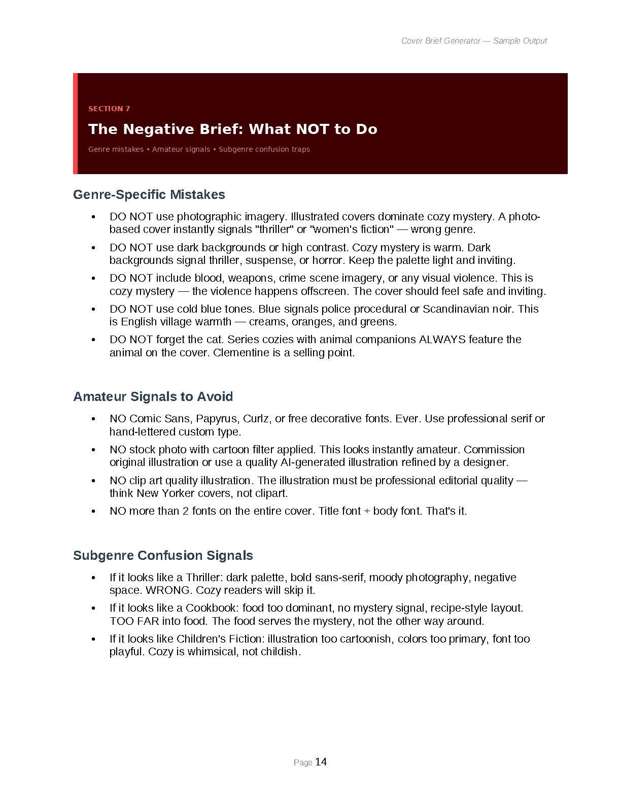 - The Negative Brief: Comprehensive “what NOT to do” list including genre-specific mistakes, subgenre confusion signals, amateur indicators, fonts that scream self-published, and color combinations that signal wrong emotion